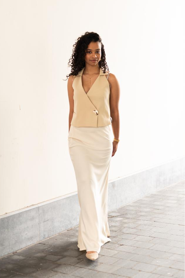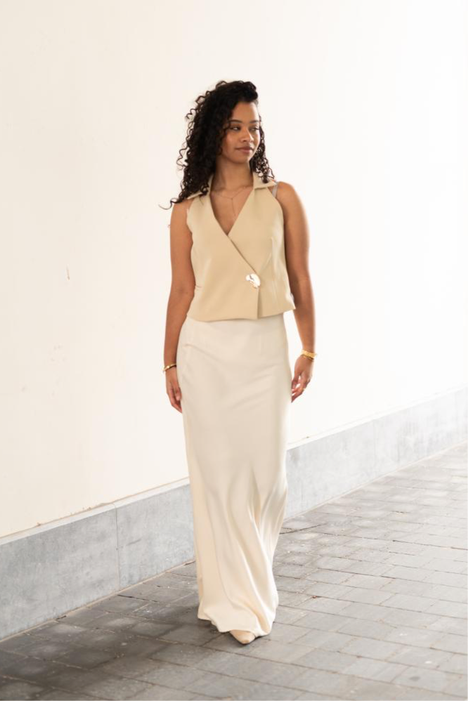 Beige top met goude knoop.